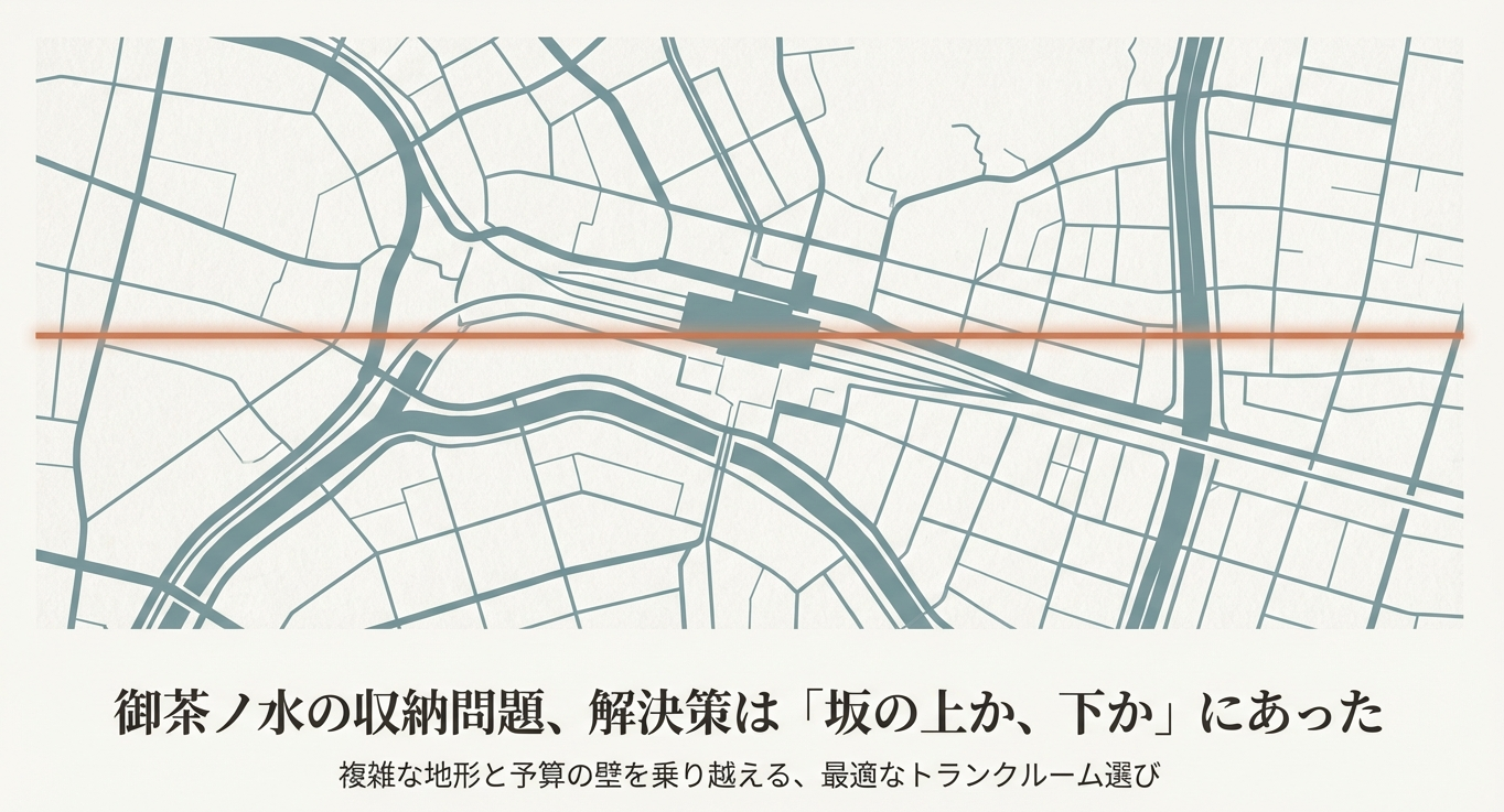 御茶ノ水エリアでトランクルームを探す際、最も重要なのは「自分が普段どちらの改札を利用しているか」、そして「坂道のどちら側に住んでいるか」です。御茶ノ水駅は神田川沿いの高台にあり、秋葉原や神保町方面へ行くには坂を下る必要があります。